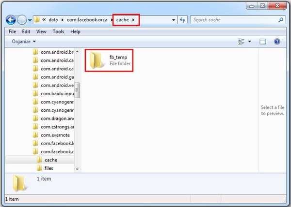 • Procure a pasta que contém o nome do Facebook “com.facebook.orca” e depois vá em Cache> fb_temp. Aqui, você obterá todo o cópia de segurança da conversa do Facebook e poderá facilmente recuperar as mensagens do Facebook dos arquivos de cópia de segurança.