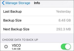 Etapa 4: e, em “Escolher dados para backup“, verifique se o controle deslizante do aplicativo VSCO está ativado